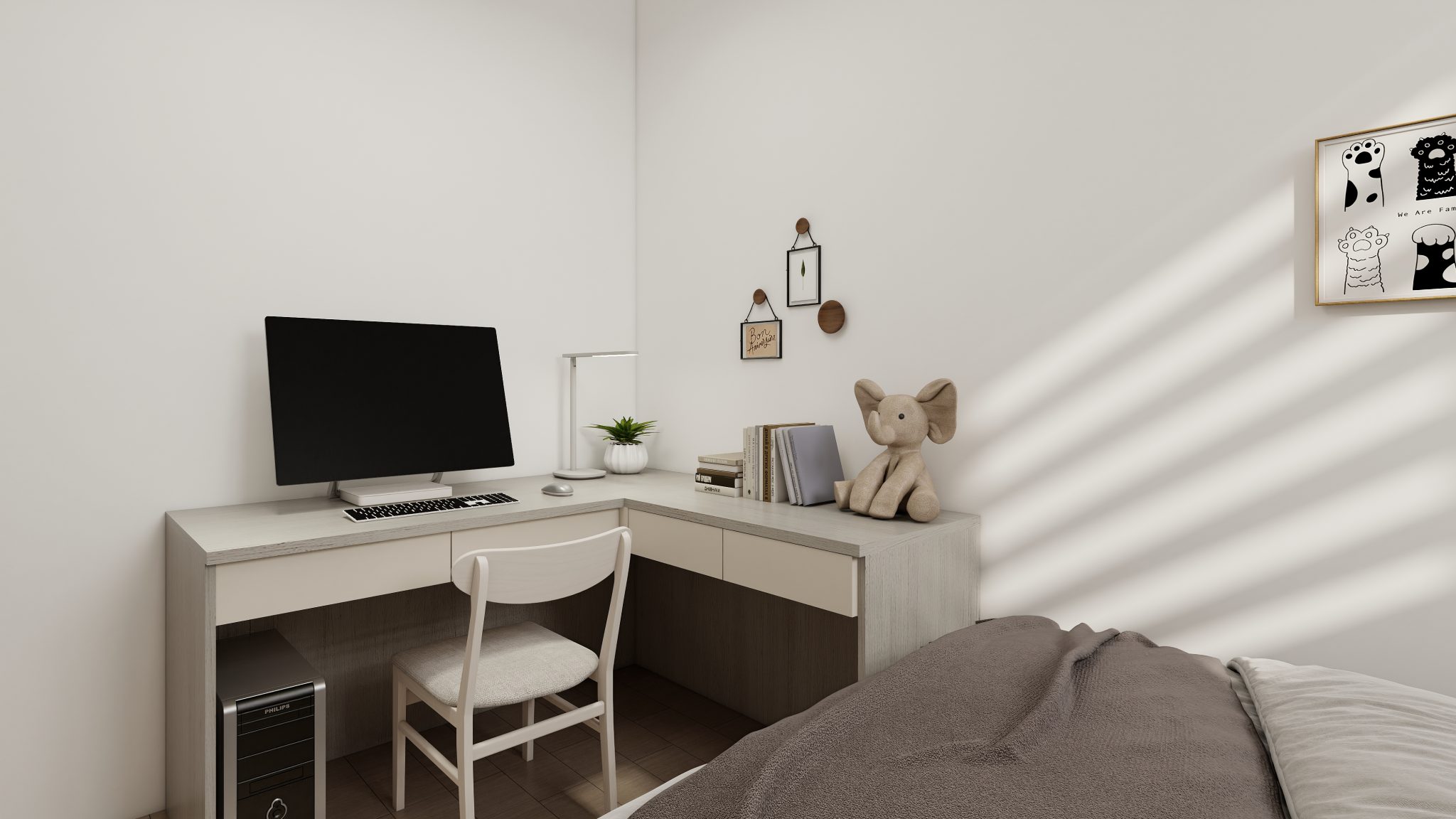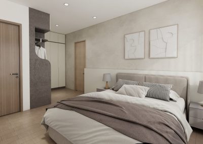 安平Unipark案使用冷色調為基底,將寬闊的起居區域劃分為玄關、書房、客餐廳,使動線明瞭合理,方正方便。