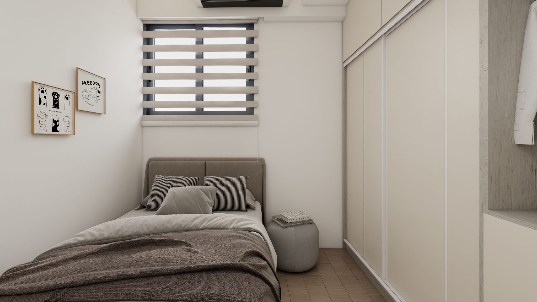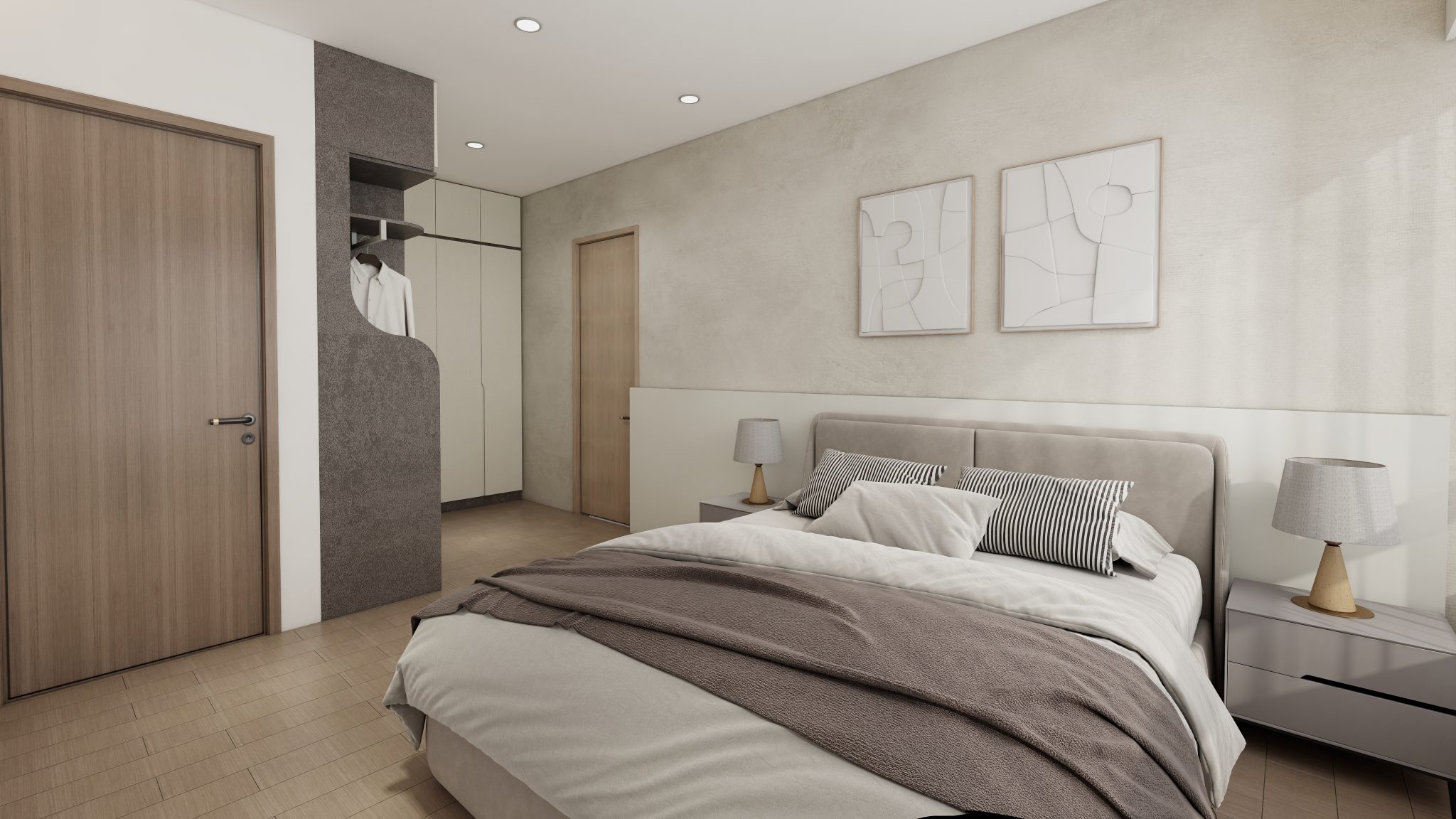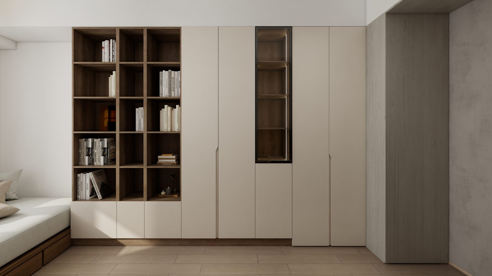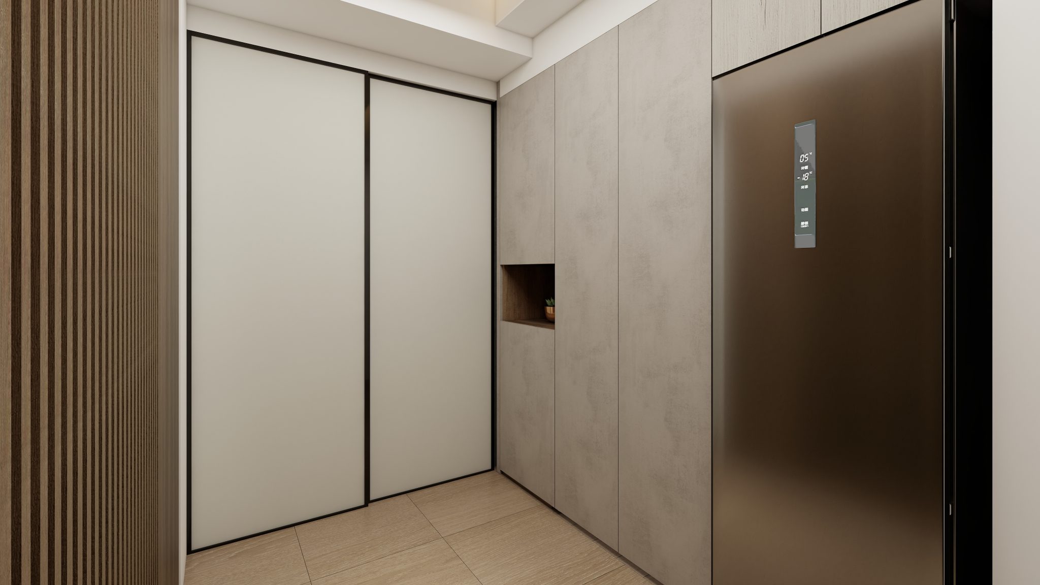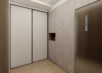 玄關胡桃木色格柵收納櫃為冷調氛圍增添古韻,隱藏式書房門除了美觀,也給予書房隱私感,不同形式的收納櫃體滿足文房應對書籍、文具、展示品等需求。
