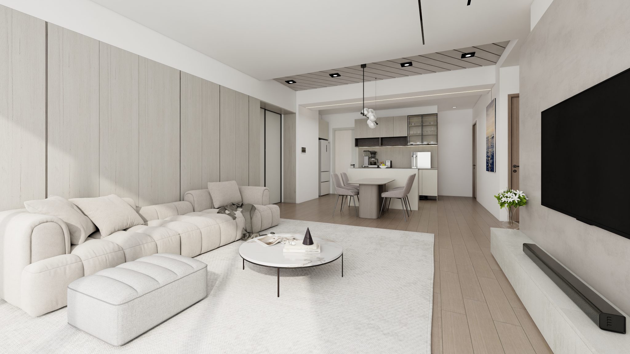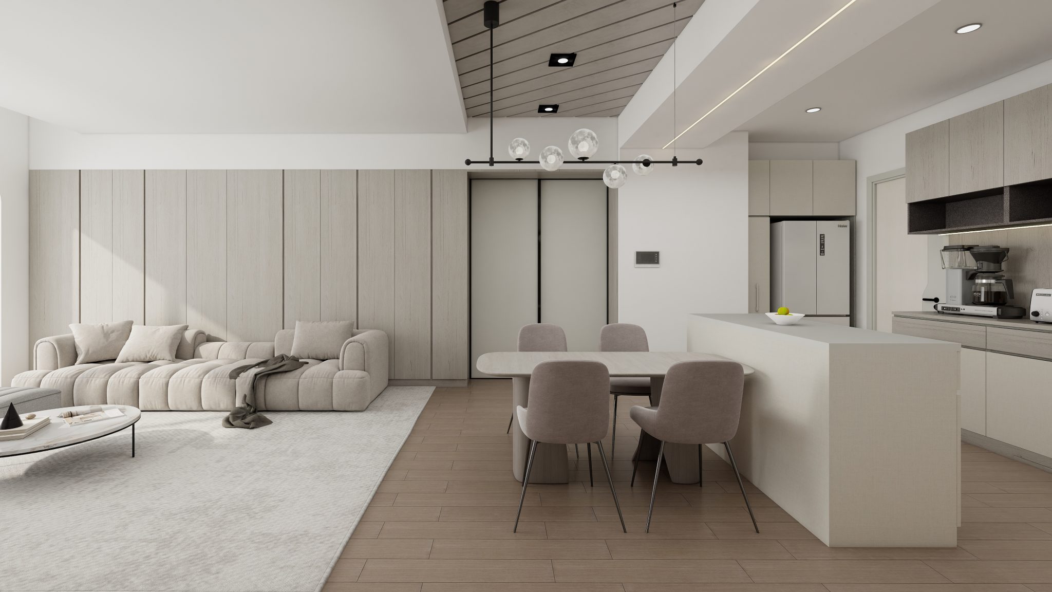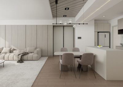 客廳大面收納櫃融入牆面,弧形窗簾盒減少視覺衝突,大氣又不失簡約感。除了餐廳寬敞的茶水吧,廚房也做了整面電器櫃及料理檯面,不論熱火烹油還是怡情小酌或是開派對招待客人都相當適合。