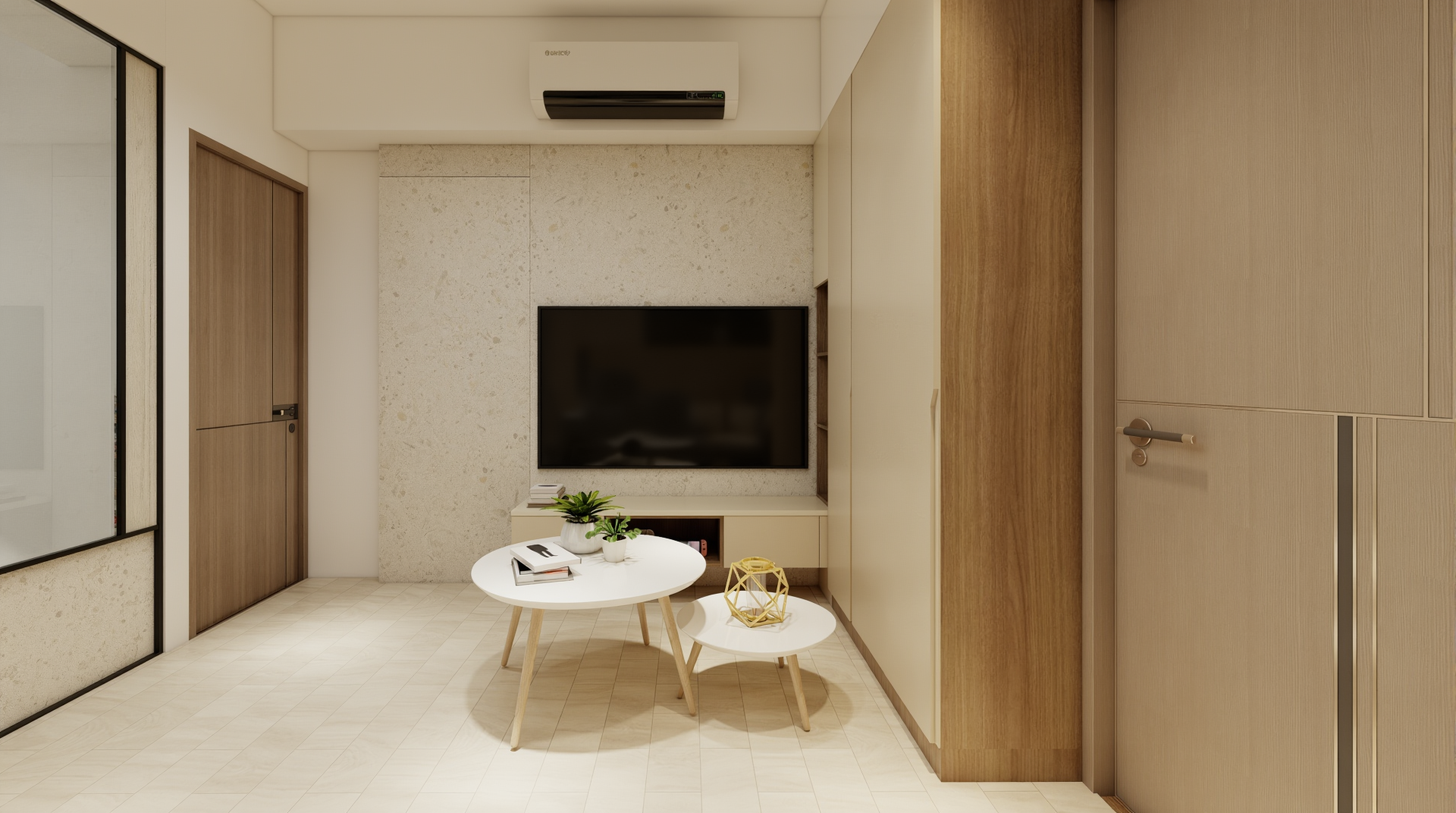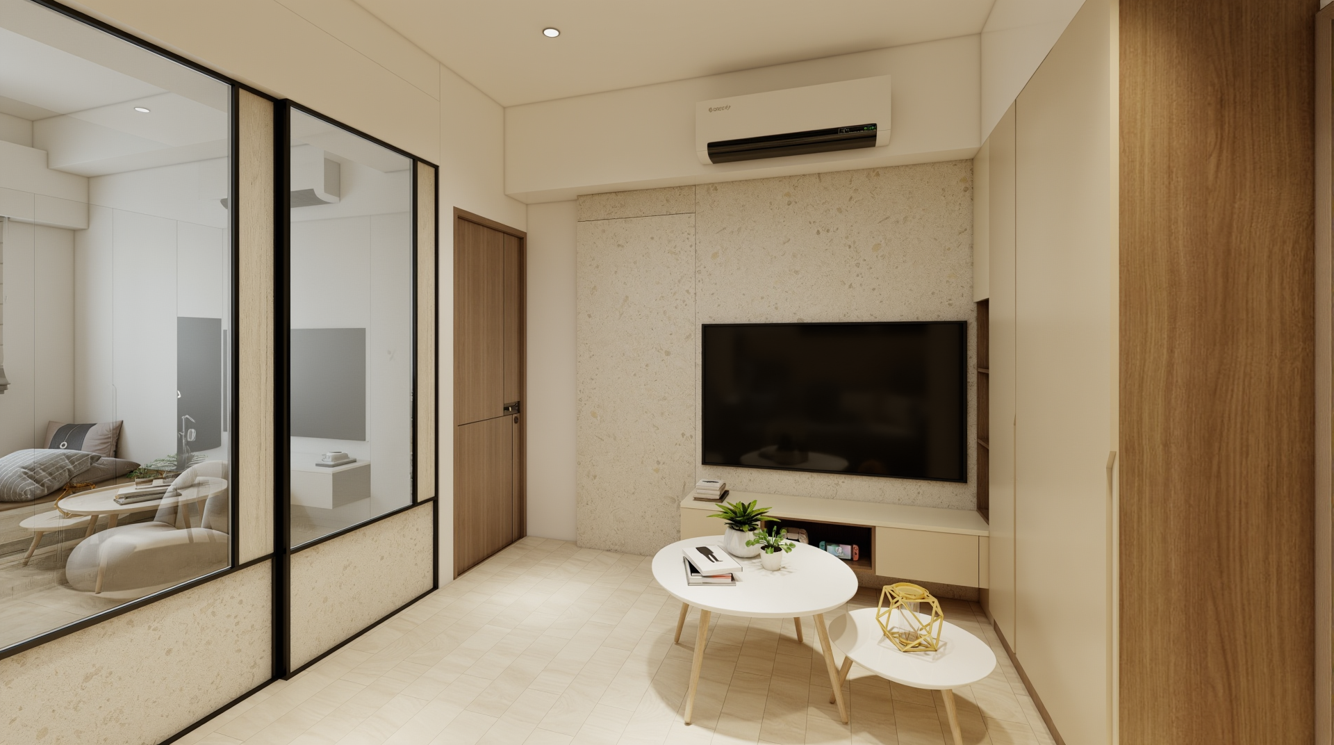 施作內容|天花板、櫃體上封板、冷氣包管、窗簾盒、隔間牆、推拉門上風板圓弧造型、推拉門、玻璃、系統家具、水電工程、保護工程、油漆工程